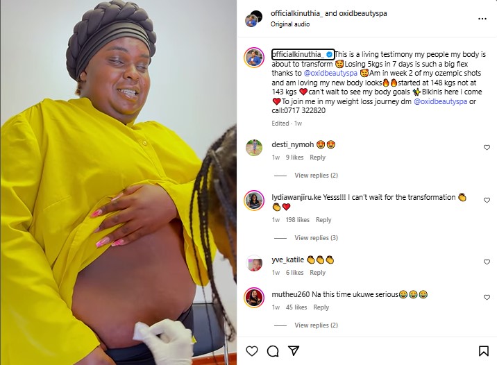 However, it was Kinuthia’s switch to Ozempic that truly elevated his transformation. On May 13, 2025, Kinuthia shared an update with his Instagram followers, revealing that he had started Ozempic injections at 148 kilograms and lost 5 kilograms within a week. “This is a living testimony, my people; my body is about to transform,” he wrote. “Losing 5 kgs in 7 days is such a big flex. I am in week 2 of my Ozempic shots and loving my new body look. Bikinis, here I come.”