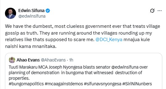 “We have the dumbest, most clueless government ever that treats village gossip as truth. They are running around the villages, rounding up my relatives like that’s supposed to scare me. @DCI_Kenya mnajua kule naishi kama mnanitaka,” Sifuna stated.