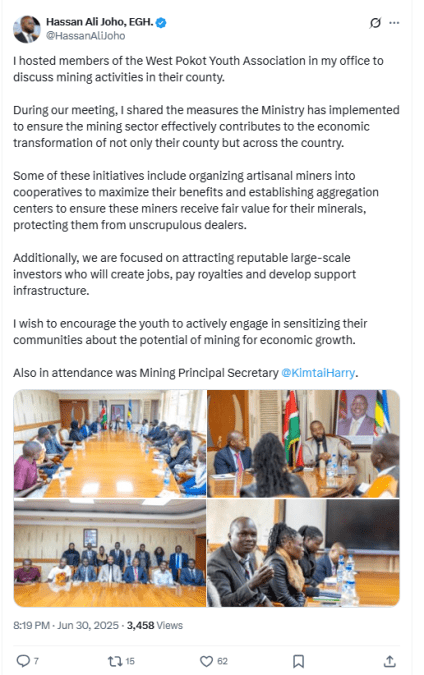 “Some of these initiatives include organising artisanal miners into cooperatives to maximise their benefits and establishing aggregation centres to ensure these miners receive fair value for their minerals, protecting them from unscrupulous dealers,” Joho wrote on X.