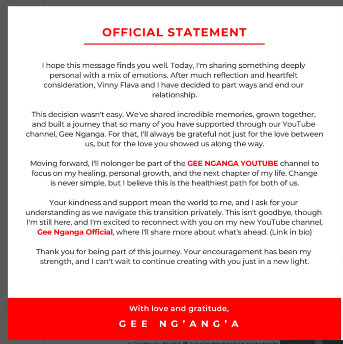 “Moving forward, I will no longer be part of the Gee Nganga YouTube channel. I am choosing to focus on my healing, personal growth, and what lies ahead. Change is never simple, but I believe this is the healthiest path for both of us,” she added.