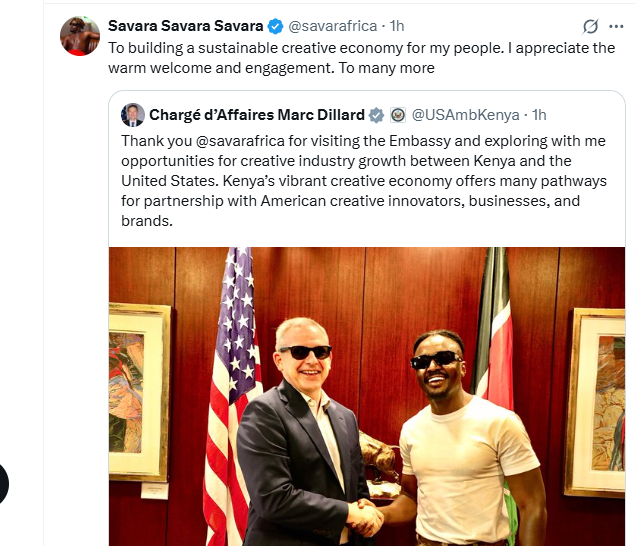 “Thank you, @savarafrica, for visiting the Embassy and exploring with me opportunities for creative industry growth between Kenya and the United States. Kenya’s vibrant creative economy offers many pathways for partnership with American creative innovators, businesses, and brands.” Dillard wrote on X.