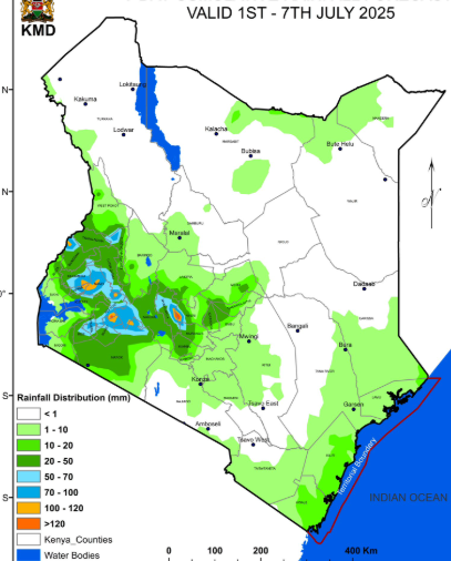 In a statement on Tuesday, July 1, 2025, the department revealed that rainfall is expected in the Highlands, East and West of the Rift Valley, Lake Victoria Basin, parts of the Rift Valley, the Coastal Region, and in some sections of Northeastern and Northwestern Kenya.