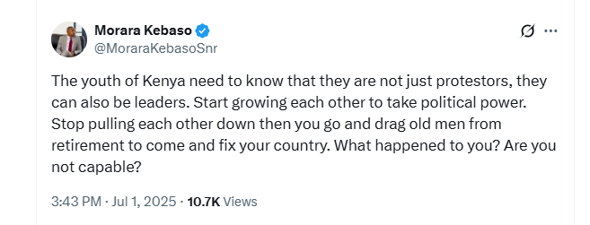 Morara’s remarks come amid growing concerns about the persistent reliance on retired political figures to address contemporary challenges, a trend he decried as symptomatic of a deeper failure among the youth to seize their own political agency.