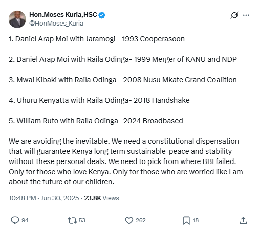 “1. Daniel Arap Moi with Jaramogi – 1993 Cooperation, 2. Daniel Arap Moi with Raila Odinga – 1999 Merger of KANU and NDP, 3. Mwai Kibaki with Raila Odinga – 2008 Nusu Mkate Grand Coalition, 4. Uhuru Kenyatta with Raila Odinga – 2018 Handshake, 5. William Ruto with Raila Odinga – 2024 Broad-based. We are avoiding the inevitable. We need a constitutional dispensation that will guarantee Kenya long-term sustainable peace and stability without these personal deals,” Kuria stated.