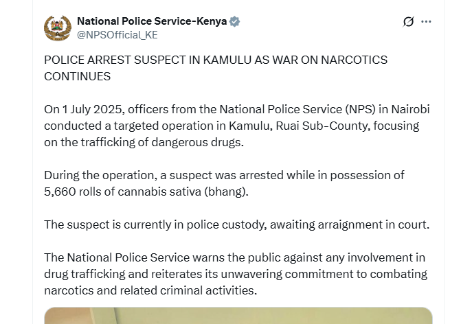 “On 1 July 2025, officers from the National Police Service (NPS) in Nairobi conducted a targeted operation in Kamulu, Ruai Sub-County, focusing on the trafficking of dangerous drugs. During the operation, a suspect was arrested while in possession of 5,660 rolls of cannabis sativa (bhang),” the NPS noted.