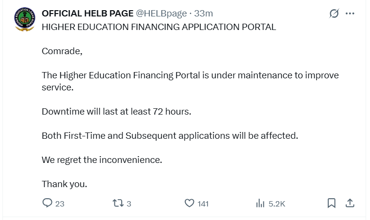 “Comrade, the Higher Education Financing Portal is under maintenance to improve service. Downtime will last at least 72 hours. Both first-time and subsequent applications will be affected. We regret the inconvenience. Thank you.” Read part of the post addressing comrades.