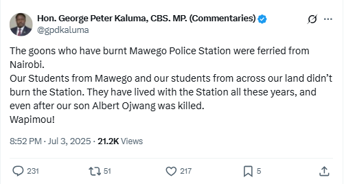 “The goons who have burnt Mawego Police Station were ferried from Nairobi. Our students from Mawego and our students from across our land didn’t burn the station. They have lived with the Station all these years, even after our son Albert Ojwang was killed. Wapimou!” Kaluma stated.
