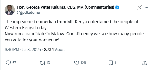 “The impeached comedian from Mt Kenya entertained the people of Western Kenya today. Now running a candidate in Malava Constituency, we see how many people can vote for your nonsense!” Kaluma stated.