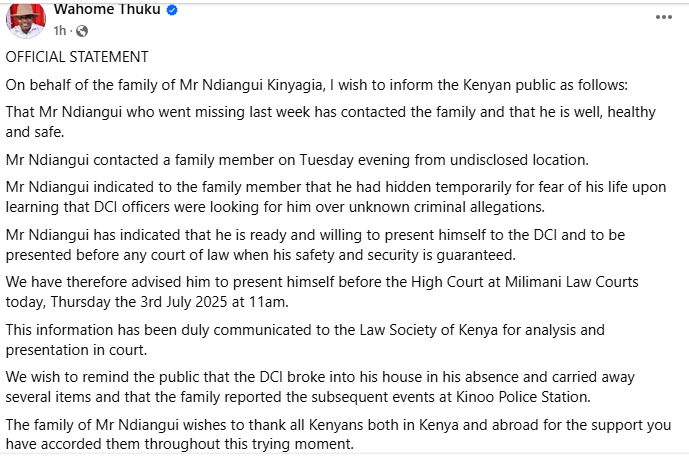 “Ndiangui has indicated that he is ready and willing to present himself to the DCI and to be presented before any court of law when his safety and security are guaranteed. We have therefore advised him to present himself before the High Court at Milimani Law Courts today, Thursday the 3rd July 2025 at 11:00 am,” the lawyer added.