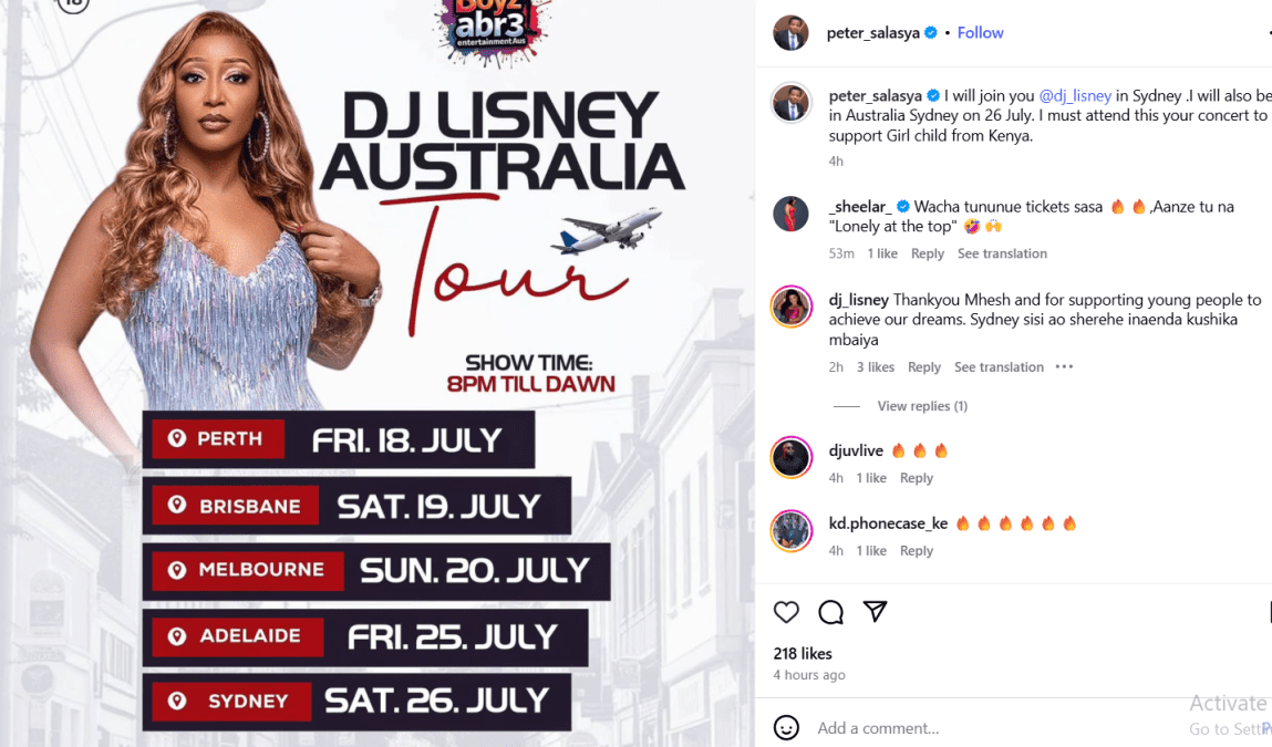 “I will join you, @dj_lisney, in Sydney. I will also be in Sydney, Australia, on 26 July. I must attend your concert to support the girl child from Kenya,” Salasya stated.