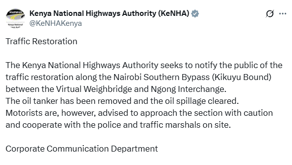 The Kenya National Highways Authority (KeNHA) has now confirmed that traffic has been restored along the Nairobi Southern Bypass (Kikuyu-bound) between the Virtual Weighbridge and Ngong Interchange following the successful removal of the overturned oil tanker and clearance of the spill.