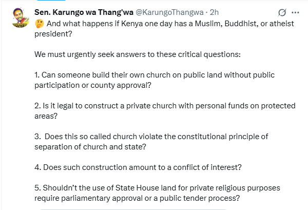 A post by Karungo wa Thang’wa on X questioning the legality of Ruto’s State House church project. PHOTO/Screengrab by K24 Digital from a post on X by @KarungoThangwa
