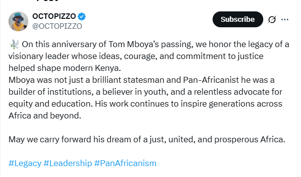Kenyan rapper and activist Henry Ohanga, famously known as Octopizzo, has paid tribute to the late Tom Mboya, describing him as a visionary leader whose legacy continues to shape Kenya and inspire generations across Africa.