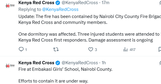 “Fire at Embakasi Girls’ School, Nairobi County. Efforts to contain it are underway,” read a statement by the Kenya Red Cross posted on the X account.