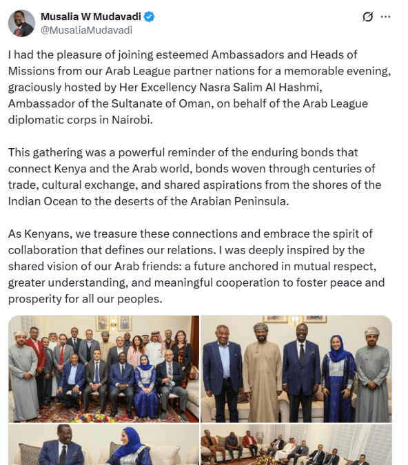 In a statement posted on X dated July 6, 2025, Mudavadi described the evening as a “powerful reminder of the enduring bonds that connect Kenya and the Arab world,” reflecting on centuries of shared trade, cultural exchange, and diplomatic engagement.