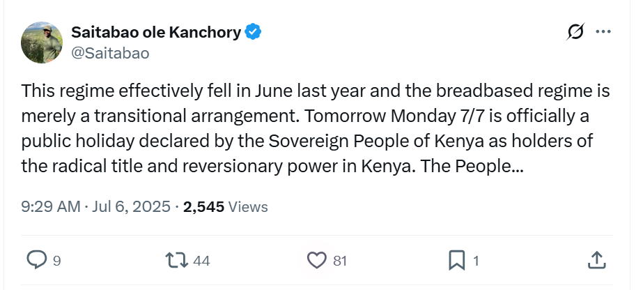 “This regime effectively fell in June last year, and the bread-based regime is merely a transitional arrangement. Tomorrow, Monday 7/7, is officially a public holiday declared by the Sovereign People of Kenya as holders of the radical title and reversionary power in Kenya. The People,” his statement on X read.
