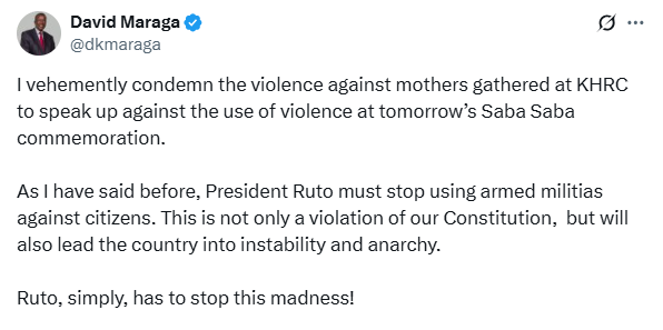 “I vehemently condemn the violence against mothers gathered at KHRC to speak up against the use of violence at tomorrow’s Saba Saba commemoration,” Maraga said in a statement released Sunday evening through his X account.