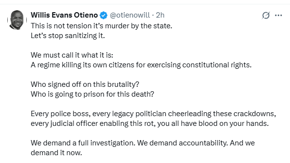 “This is not tension; it’s murder by the state,” Otieno declared on Sunday, July 13, 2025, on his X account, in response to the escalating death toll of demonstrators killed during anti-government protests.