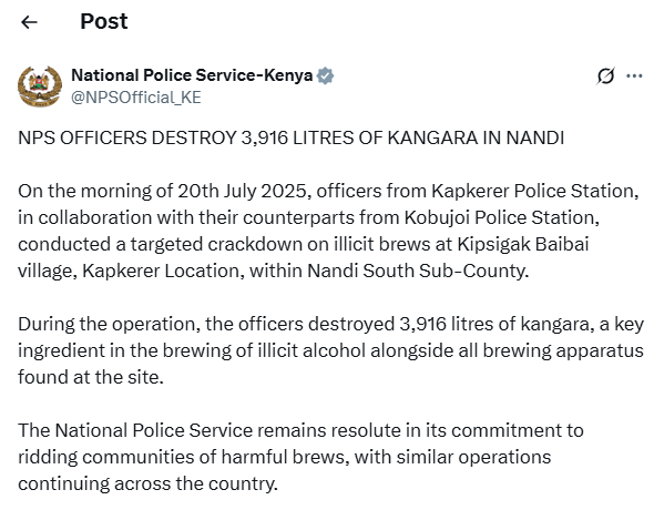 According to a statement posted on the National Police Service’s (NPS) official X account, the enforcement effort was a joint operation involving officers from Kapkerer Police Station and their counterparts from Kobujoi Police Station.