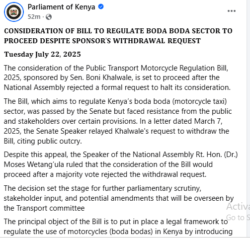 The National Assembly has rejected a request to withdraw the controversial Public Transport Motorcycle Regulation Bill, 2025, setting the stage for continued debate over proposed regulations for Kenya’s vibrant boda boda sector.