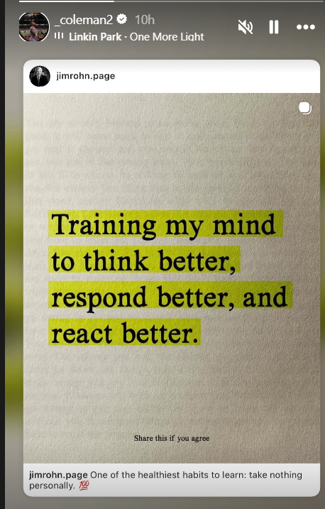 “Training my mind to think better, respond better and react better,” were the words from an account going by the name Jimrohn.page which Coleman reposted, seeming to agree with the take after his recent run-in with law enforcement officers.
