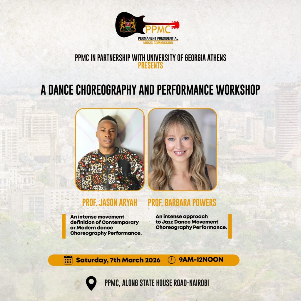 The Permanent Presidential Music Commission (PPMC), in partnership with the University of Georgia, Athens, will host a Dance Choreography & Performance Workshop in Nairobi on Saturday, March 7, 2026.