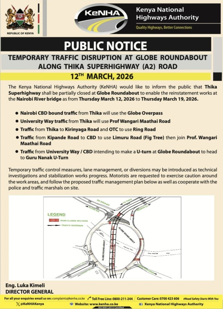 Transport along Thika Superhighway will be disrupted following the partial closure at Globe Roundabout to allow the reinstatement of the Nairobi River bridge.