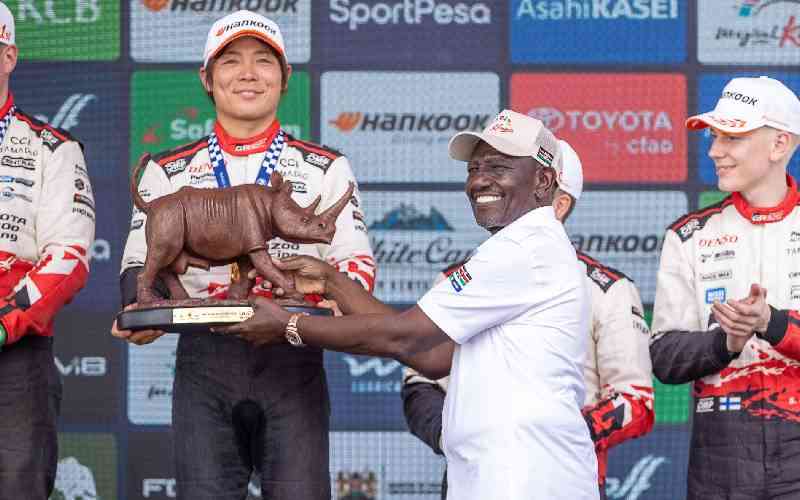 President William Ruto presents the trophy to Takamoto Katsuta after powering to victory during the 2026 WRC Safari Rally Kenya in Naivasha on March 15, 2026. [PCS]