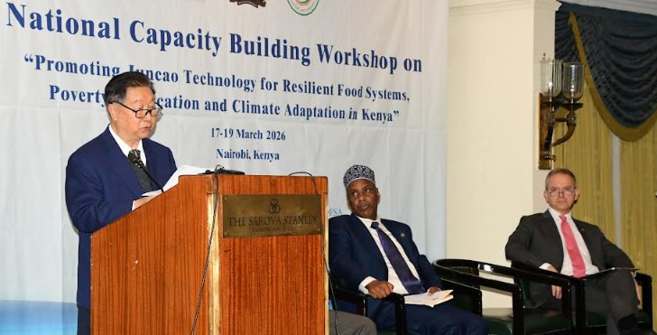 Prof, Lin Zhanxi, Chief Scientist and Innovator of Juncao Technology, make his remarks during  the official opening of a three-day workshop  on the National Capacity Building Conference on JUNCAO Grass Technology and Kenya’s inclusion in Phase III of the UN-DESA JUNCAO Technology project held  at the Sarova Stanley Hotel, Nairobi  on 18th March 2026, when he disclosed  that Juncao Technology can be harnessed to cultivate edible and medicinal mushrooms, produce livestock feeds and green fertilizer, conserve soil and control desertification.