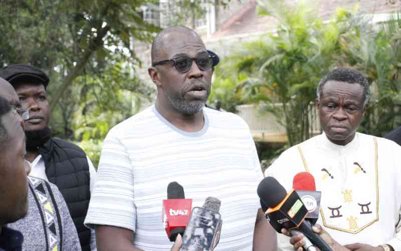 Paul Nyamodi, Tuju’s lawyer, addresses press at Entim Sidai Hotel in Karen, Nairobi, flanked by PLO Lumumba and family friends. March 22, 2026. [Edward Kiplimo, Standard]