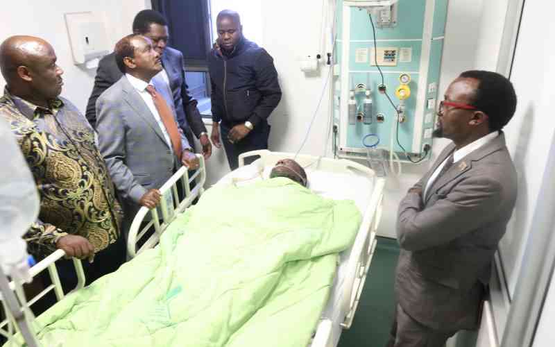 Kalonzo Musyoka, Eugene Wamalwa and Ndegwa Njiru stand beside Raphael Tuju’s hospital bed at Karen Hospital. [Courtesy, KMPS]