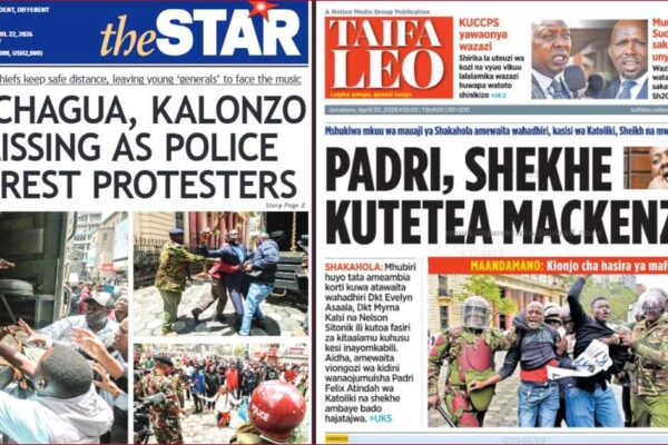 Newspapers on Wednesday, April 22, reported on the failed demonstration that was planned for Tuesday, with the leaders of the Opposition being highlighted for their failure to show up despite advising Kenyans to come out in large numbers and protest against high fuel prices. The front pages of The Star and Taifa Leo newspapers. Photo:…